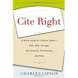 Cite Right: A Quick Guide to Citation Styles--MLA, APA, Chicago, the Sciences, Professions, and More (Chicago Guides to Writing, Editing, and Publishing) ReviewThere is simply no one writing on this topic today who has a firmer grasp of the subject, a clearer literary style of writing, or a finer mind than Professor Charles Lipson of the University of Chicago. Buy this book, give it to your friends, especially those who are in school, or are about to embark on high school, college or graduate work of any kind, including law, natural and social sciences as well as the humanities. With clear examples, admirable (but not in the least tiring) detail, Professor Lipson hits this one out of the park. He is the nation's, indeed the world's leading expert on the topics addressed in this book. No home should be without it, and no young person should enter college without having read it the summer before college begins. I cannot recommend it highly enough---although I am certainly trying to do so.Cite Right: A Quick Guide to Citation Styles--MLA, APA, Chicago, the Sciences, Professions, and More (Chicago Guides to Writing, Editing, and Publishing) OverviewWant to learn more information about Cite Right: A Quick Guide to Citation Styles--MLA, APA, Chicago, the Sciences, Professions, and More (Chicago Guides to Writing, Editing, and Publishing)?